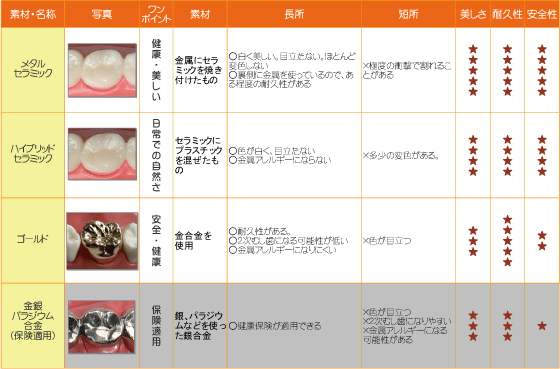 | かぶせものには、使用する材料により
